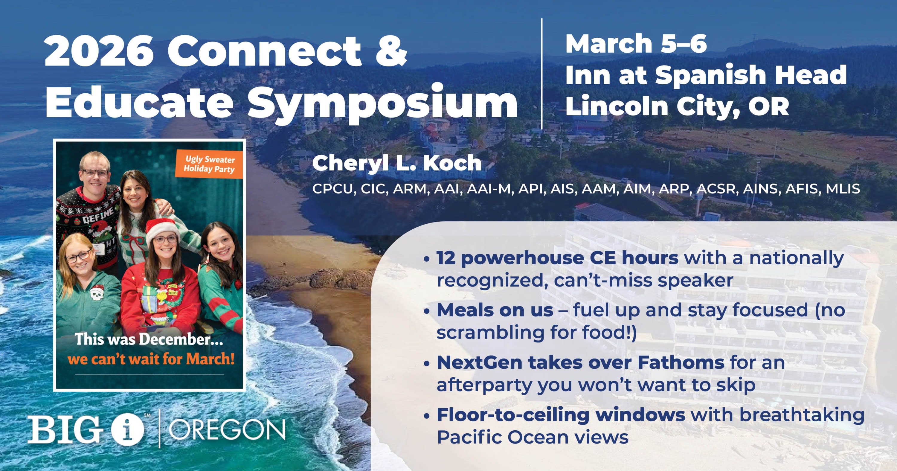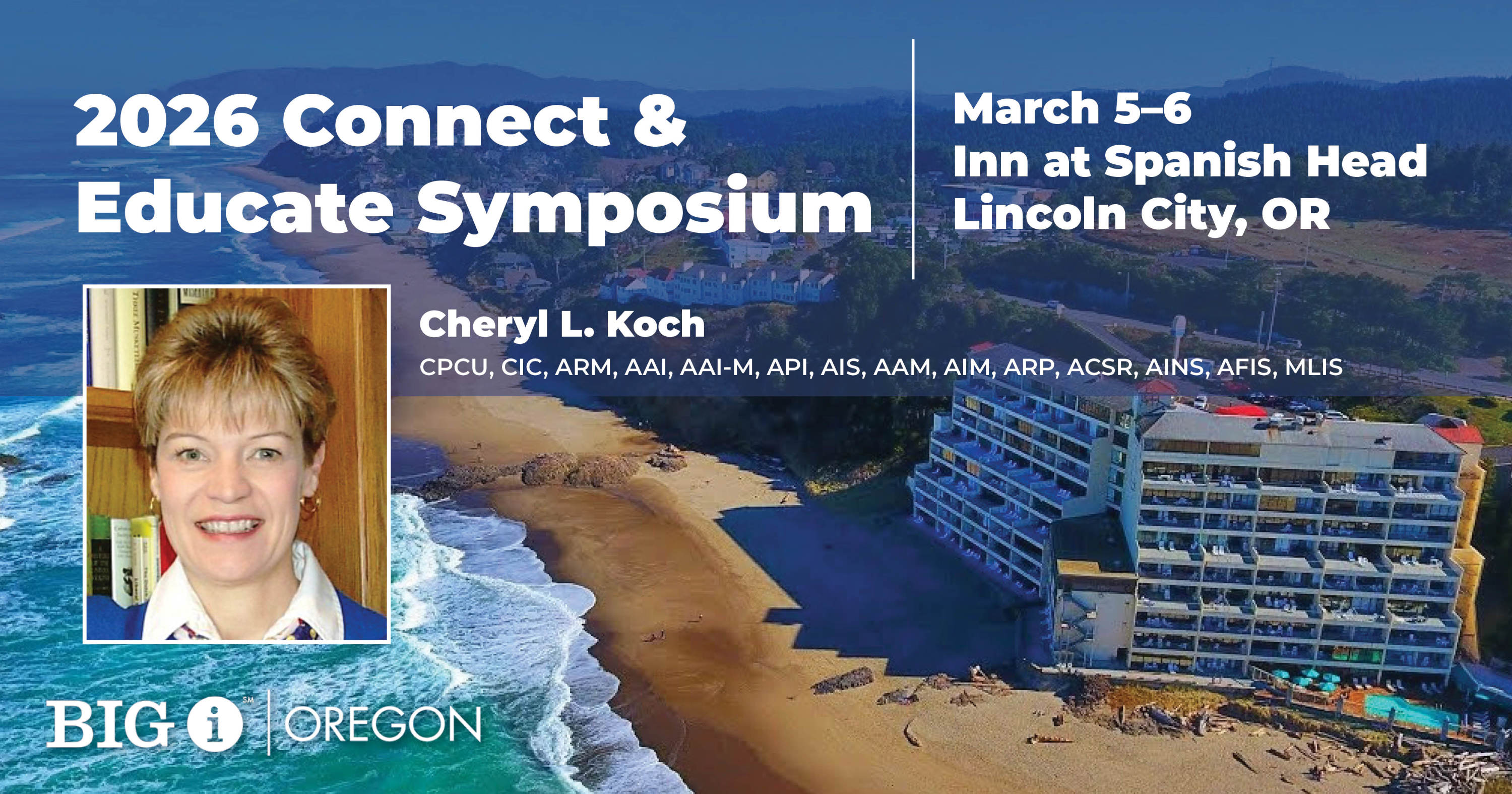 2026 Connect & Educate Symposium3/5/2026 - 3/6/2026DescriptionJoin Big I Oregon for our Connect & Educate Symposium March 5-6, 2026 at the Inn at Spanish Head in Lincoln City, OR. Our CE Symposium on March 5th and 6th will be held at the stunning Inn at Spanish Head in Lincoln City, OR. This two-day event is a great way to deepen your knowledge base, engage in impactful discussions, and energize your professional network. 3 dynamic sessions focused on essential topics designed to elevate your expertise and empower you to better serve your clients. Receive 12 hours of continuing education approved in Oregon, Washington, and Idaho, while soaking in the breathtaking views of the Oregon coast. This is your chance to learn, grow, and connect with peers in a beautiful, relaxed setting. Sessions: